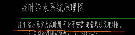 75. 如下图所示:4.20日答疑回复战时给排水仅计预埋,图纸说明与原理图下面的注1说明不一致,战时给水管道(比如:箭头所指管道)是否在本次招标范围?