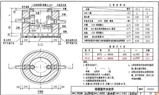 答:工作井和接收井材质规模尺寸见设计大样图;水封井采用砖砌结构,规格为ZS-1型,尺寸详见图集04S519小型排水构筑物38页。