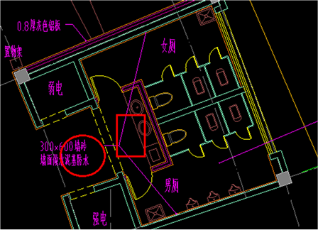 5.   请明确下面截图中圆形和方形区域墙面是否做防水,是否参照卫生间装饰做法计入。