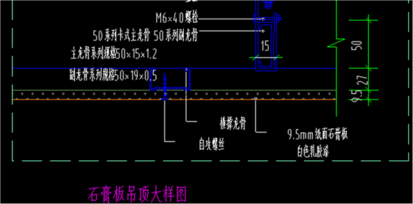 答:石膏板吊顶做法为龙骨加9厚阻燃板加双层石膏板加乳胶漆面做法。
