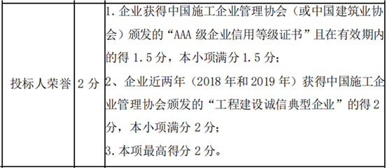 4、关于招标文件2.2.3(1)业绩、奖项、荣誉---投标人荣誉---第二条:企业近两年(2018年和2019年)获得中国施工企业管理协会颁发的“工程建设诚信典型企业”的得2分,本小项满分2分。