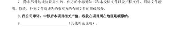 回复:招标文件商务文件投标函格式第八条内容,投标人可以自行添加补充,但不得修改实质性内容。如投标人不采取补充添加方式的,也可以按招标文件格式要求线下制作后盖章扫描上传至商务文件“其他材料”中。