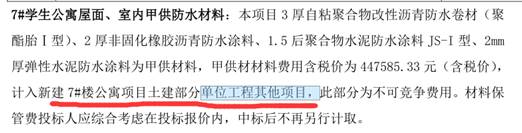 ②3#分配扩建(土建装饰)单位工程中的防水甲供材已计入新建7#学生公寓(土建装饰)单位工程其他项目清单与计价汇总表中。