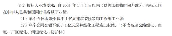 (1)上述对投标人装饰装修工程施工业绩及园林绿化工程施工业绩(包括门槛及加分业绩)均要求单个合同金额不低于1亿元,因纯装饰装修工程施工业绩或园林绿化工程施工业绩单个合同额不低于1亿元的非常少,建议:单个施工总承包或工程总承包合同内包含装饰装修工程或园林绿化工程施工内容的,且相应部分造价不低于1亿元的,或装饰装修业绩为装修改造业绩的,均予以认可;若投标人提供资料不足以证明的,可提供业主证明材料。