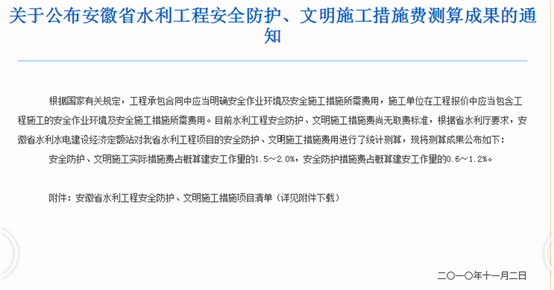 2)、三、编制依据7、安全防护、文明施工措施费用参照二〇一〇年十一月二日安徽省水利厅《关于公布安徽省水利工程安全防护、文明施工措施费用测算成果的通知》计取。本通知是针对概算建安工程取费的,投标是采用预算定额,内容为施工安全措施费,如何记取,请明确?