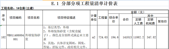 2、1#仓库(土建)单位工程工程量清单第102项 “外墙装饰砂浆”(项目编码:WB011406004001),综合单价由151.72元/平方米调整为194.6元/平方米;最高限价表格调整如下: