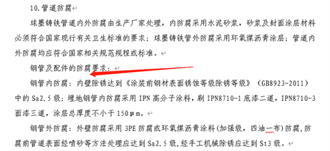 答:不涉及钢管防腐,设计给水管材均为球墨铸铁管,无钢管管材。