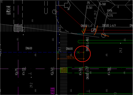 答:此处三通型号为球墨铸铁三通(DN600×DN500),三通下边再接一个双承渐缩管(DN500×DN300)。