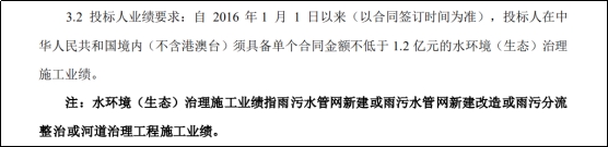 3.2 投标人业绩要求:自 2016 年1 月 1 日以来(以合同签订时间为准),投标人在中华人民共和国境内(不含港澳台)须具备单个合同金额不低于1.2亿元的水环境(生态)治理施工业绩。