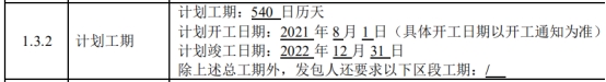 6、请问:招标文件须知前附表中第1.3.2条计划总工期为540日历天,但计划开工日期为2021年8月1日,计划竣工日期为2022年12月31日,实际时间间隔为518天,请明确准确工期。
