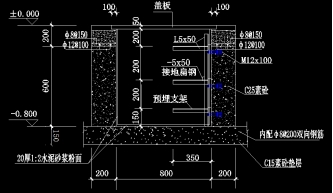 ,图示尺寸为800*800mm,具体尺寸以图纸标注为准,做法参照以上图纸,其中垫层为C25,沟壁为C35,盖板采用高强度无机复合盖板,板宽500mm,支架间距2m,排水管不计。