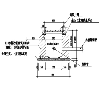 请明确下图所示电缆沟的具体结构及抹面做法,及对应材质、规格尺寸。请明确排水管的材质及工程量如何确定。