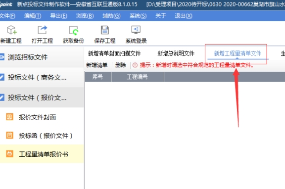 (1)上图中红框处新增总说明文件中导入报价文件(包含:投标函、工程量清单报价书)。