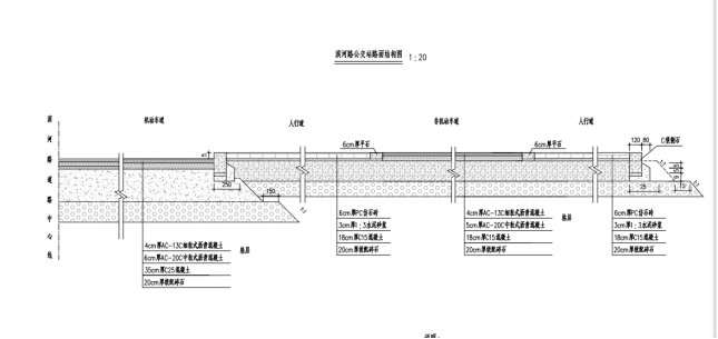 答:此处为道口恢复段,机动车道、非机动车道和人行道的工程量均在最高投标限价中按此工程量表考虑,其做法及范围如下图所示,