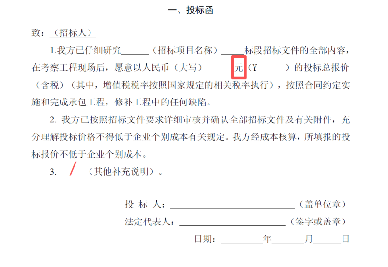 17、清单提供的模板都是保留两位小数,是否去掉投标函中的“元”字;其他补充说明如果没有是否可以填“/”。