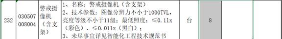 1、名称:警戒摄像机(含支架) 2、技术参数:图像分辨力不小于1000TVL,亮度等级不小于11级;最低照度:≤0.1lx(彩色)、≤0.01lx(黑白); 3、未尽事宜详见智能化工程技术规范书 |