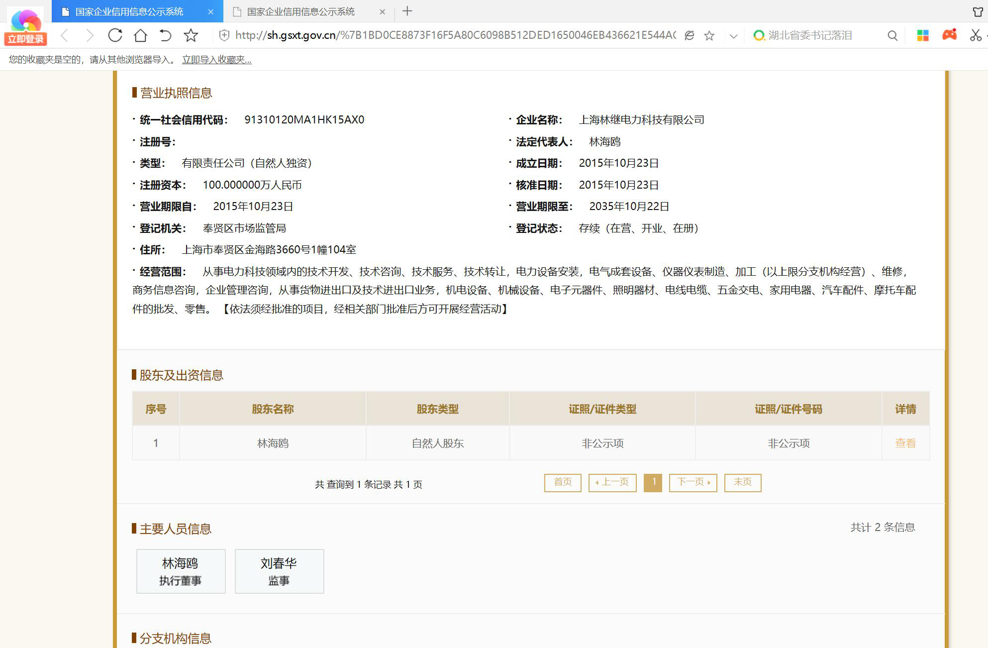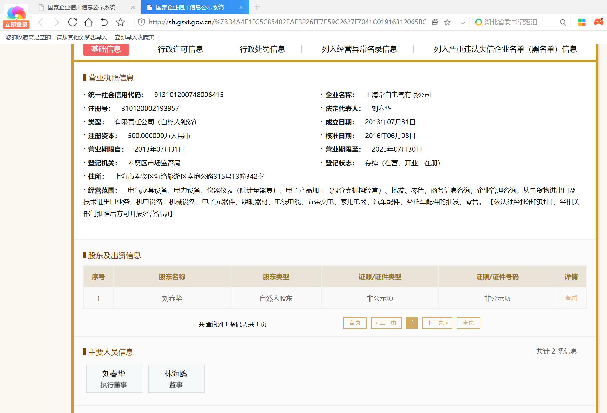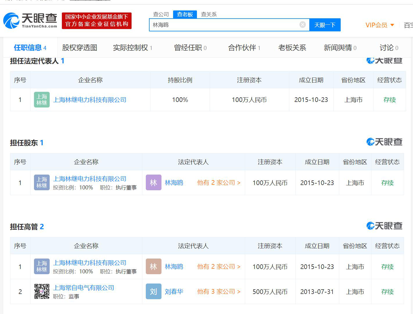 上海林继电力科技有限公司和上海常自电气有限公司属于关联公司。企业工商注册中查询发现:上海常自电气有限公司的监事:林海鸥。为上海林继电力科技有限公司的法人。上海常自电气有限公司的法人:刘春华,同时担任上海林继电力科技有限公司的监事。存在一类产品的品牌推荐,使用两家关联公司行为,不难想象该品牌表属于操作行为。