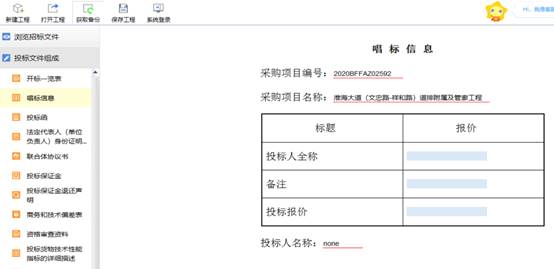 6、投标制作软件中唱标信息模块,默认采购项目名称与招标文件项目名称不一致,请确认是否需要调整?另投标人名称系统默认为none,请确认是否需要调整?备注一栏需要填入内容,请问此处是否可以填“无”或者符号“/”?