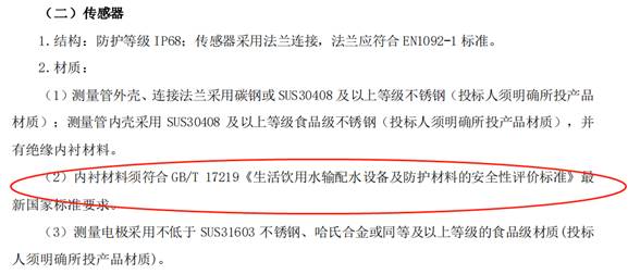 而评分要求  认证证书 第3条 投标人所投电磁流量计产品衬里材质具有国际饮用水认证证书(如NSFWRAS