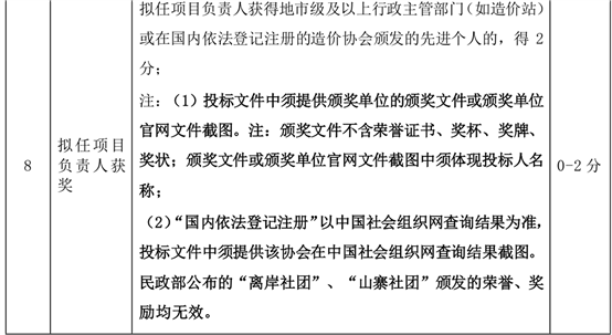 12.招标文件第35页技术部份详细评审表中“拟任项目负责人获奖”栏要求“拟任项目负责人获得地市级及以上行政主管部门(如造价站) 或在国内依法登记注册的造价协会颁发的先进个人的,得 2 分。”《招投标法》第二十条:招标文件不得要求或者标明特定的生产供应者以及含有倾向或者排斥潜在投标人的其他内容,此条违反《招投标法》第二十条规定。建议取消此项。