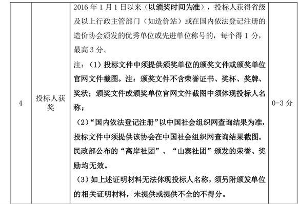 注:(1)投标文件中须提供颁奖单位的颁奖文件或颁奖单位官网文件截图。注:颁奖文件不含荣誉证书、奖杯、奖牌、奖状;颁奖文件或颁奖单位官网文件截图中须体现投标人名称