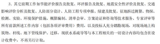 2.相关工作及评审包括:施工图设计、施工图审查报送、人防部分设计等全部内容、深基坑支护专项设计及评审、概算编制、施工中所必需的方案论证和咨询等技术服务、专家评审等工作,并依照合肥市现行相关规定要求进行建筑节能设计和专项审查工作。若投标人不具有相应资质的部分专业,经招标人书面同意后,可由中标人自行委托具有相应资质的单位承担,中标人对所有成果负总责。