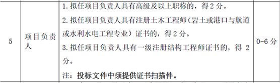 1.拟任项目负责人具有高级及以上职称的,得4分。 2.拟任项目负责人具有注册土木工程师(岩土或港口与航道或水利水电工程专业)证书的,得2分。 注:投标文件中须提供证书扫描件。 |