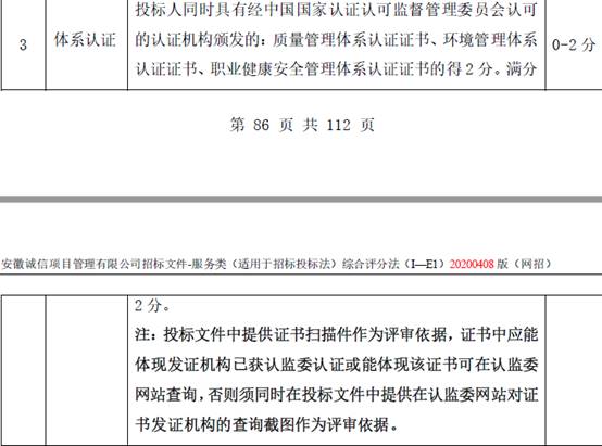 建议修改:投标人具有经中国国家认证认可监督委员会认可的认证机构颁发的质量管理体系认证证书的得2分。