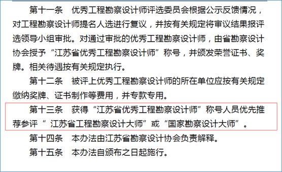 2、江苏省优秀工程勘察设计师评选与管理办法(201610月)主要条款截图;