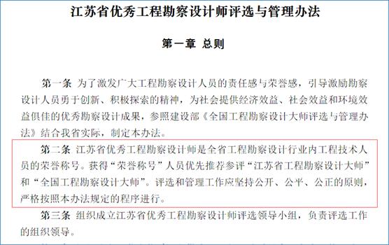 9.根据江苏省勘察设计协会于201010月颁发的江苏省优秀工程勘察设计师评选办法中第十三条:获得江苏省优秀工程勘察设计师称号人员优先推荐江苏省工程勘察设计大师国家勘察设计大师201610月颁发的江苏省优秀工程勘察设计师评选与管理办法中第二条:江苏省优秀工程勘察设计师是全省工程勘察设计行业内工程技术人员的荣誉称号。获得“荣誉称号”人员优先推荐参评江苏省工程勘察设计大师国家勘察设计大师。但经核查江苏省勘察设计协会官方网站、江苏省住房和城乡建设厅官方网站,并与江苏省勘察设计协会沟通确认,江苏省勘察设计协会在20206月之前没有评定过“江苏省勘察设计大师”荣誉称号。因此,目前江苏省对全省工程勘察设计行业内优秀工程技术人员的最高荣誉称号为江苏省优秀工程勘察设计师。附件:1、江苏省优秀工程勘察设计师评选办法(201010月)主要条款截图;