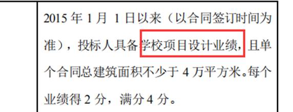 21.招标文件要求2015 年 1 月 1 日以来(以合同签订时间为准),投标人具备学校项目设计业绩,且单个合同总建筑面积不少于 4 万平方米。