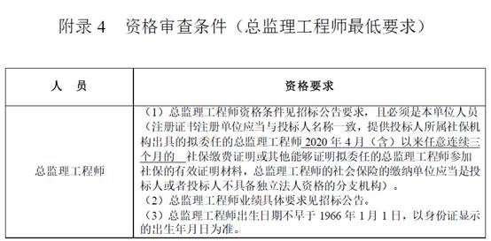 4.招标文件P23附录4“资格审查条件(总监理工程师最低要求)”第(3)项要求总监理工程师出生日期不早于196611日,而注册监理工程师执业年限国家相关规定为65周岁,且能胜任轨道交通总监岗位需要多年的监理经验积累,本工程对总监业绩经验要求较高,此条件设置是否合理?
