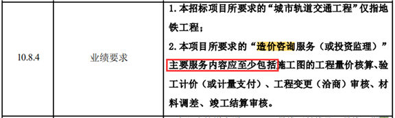 8.招标文件中资格审查及评分办法业绩均有要求下列业绩之一:(1)城市轨道交通工程土建工程和城市轨道交通工程机电设备采购的造价咨询服务(或投资监理)业绩;(2)城市轨道交通工程土建工程和城市轨道交通工程机电设备安装工程的造价咨询服务(或投资监理)业绩;