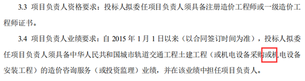 问题:全过程就应该包括甲供设备采购、机电安装以及系统的安装,单纯的采购不涉及“造价咨询服务(或投资监理)”业绩要求中的主要服务内容,3.4项目负责人业绩是否是中华人民共和国城市轨道交通工程土建工程(或机电设备采购及机电设备安装工程)?