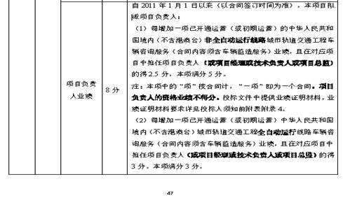 3.招标文件评分标准第47页项目负责人业绩要求:自201111日以来(以合同签订时间为准),3项已开通运营的非全自动运行线路业绩,以及1项已开通运营的全自动运行线路业绩,再加上初审业绩,总共需要5个项目负责人业绩得满分,此得分项要求过高,建议修改为符合2项已开通运营的非全自动运行线路和1项已开通运营的全自动运行线路业绩的得满分。