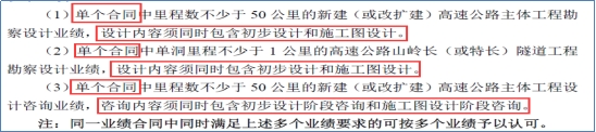 7.招标文件第4页投标人业绩要求自 2016 年 1月1日以来,时间以施工图设计批复时间为准,投标人须同时具备以下业绩:(1)单个合同中里程数不少于 50 公里的新建(或改扩建)高速公路主体工程勘察设计业绩,设计内容须同时包含初步设计和施工图设计。(2)单个合同中单洞里程不少于 1 公里的高速公路山岭长(或特长)隧道工程 勘察设计业绩,设计内容须同时包含初步设计和施工图设计。(3)单个合同中里程数不少于50公里的新建(或改扩建)高速公路主体工程设计咨询业绩,咨询内容须同时包含初步设计阶段咨询和施工图设计阶段咨询。
